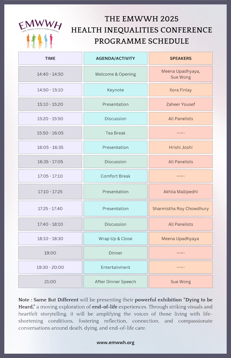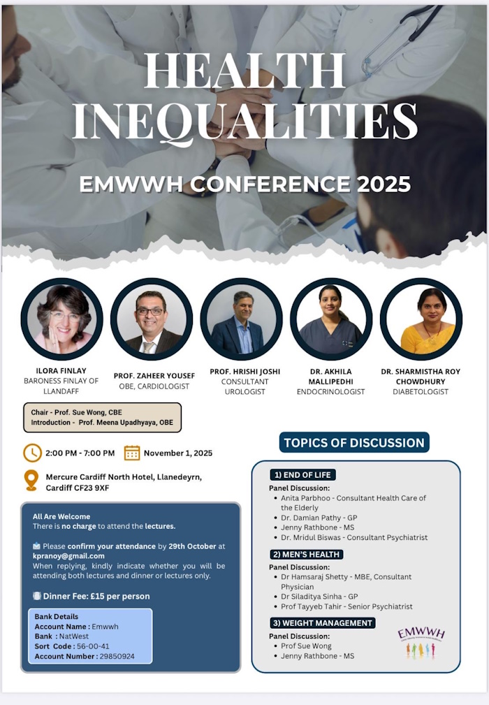 The Health Inequality Conference, organised by the Ethnic Minority Women in Welsh Healthcare (EMWWH), was held on 1 November at the Mercure Hotel, Cardiff North. The programme opened with introductory remarks from Professor Meena Upadhyaya, Chair of EMWWH, and was formally chaired by Professor Sue Wong. The event brought together clinicians, policy influencers, researchers, and community advocates to examine how structural, clinical, and cultural inequities shape health outcomes, access to care, and the lived experiences of diverse populations in Wales. From the outset, the conference emphasised the importance of equity-focused approaches in healthcare, recognising that disparities in provision and outcomes remain deeply embedded across multiple domains.